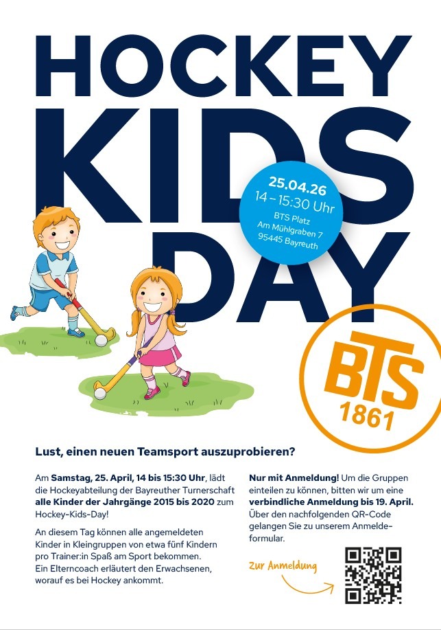 Am Samstag, 25. April, 14 bis 15:30 Uhr, lädt die Hockeyabteilung der Bayreuther Turnerschaft alle Kinder der Jahrgänge 2015 bis 2020 zum Hockey-Kids-Day!